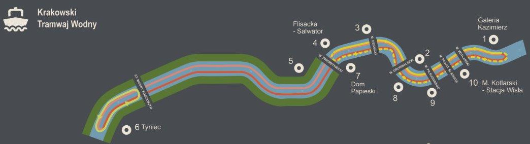 Krakowski Tramwaj Wodny zatrzymuje się przy specjalnie oznaczonych przystankach, których lokalizacja jest zaznaczona na mapce poniżej.